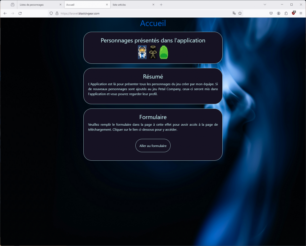 Le projet laravel est le dernier en date. Il permet après, avoir remplis un formulaire, de télécharger l’application du projet electron. Le site est divisé en trois parties : l’accueil, le formulaire et la page de téléchargement.